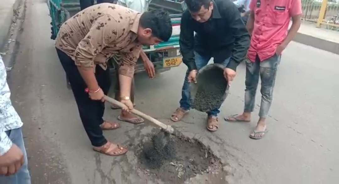युवा कांग्रेस अध्यक्ष दिग्विजय सिंह झाला ब्लॉक कांग्रेस अध्यक्ष दीपेश कानूनगो के संयुक्त प्रयास से उज्जैन रोड स्थित ब्रिज के गड्ढों को भरा गया भराव करने tv का मुख्य उद्देश्य पिछले 2 माह से हो रही दुर्घटना को को लेकर इन ब्रिज के गड्ढों को भरा गया कई बार शासन प्रशासन को सूचित करने के बावजूद भी प्रशासन द्वारा ब्रिज के गड्ढों की कोई सुध नहीं लेने के कारण आज कांग्रेस पार्टी के कार्यकर्ता एवं नेताओं द्वारा इन गड्ढों को भरा गया जैसा की विधित है कि ब्रिज एकमात्र रास्ता है नगर निगम कॉलोनी शिव शक्ति नगर विजय नगर राजा राम नगर मुखर्जी नगर अलकापुरी अनुकूल नगर मीणा श्री कॉलोनी इटावा और उज्जैन जाने के लिए एकमात्र रास्ता ब्रिज पर से होकर गुजरता है इन ब्रिज पर दुर्घटना को दावत देते कई गहरे गड्ढे हो चुके थे कई बार शासन प्रशासन को चेत आने पर भी इनकी रिपेयरिंग नहीं की गई जिसके कारण आज जनहित में कांग्रेस पार्टी को इन गड्ढों को रिपेयर कर रही है