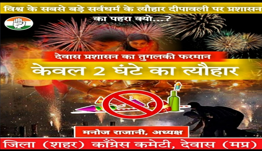 देवास जिला शहर कांग्रेस कमेटी देवास केवल 2 घंटे आतिशबाजी की अनुमति देने के निर्णय की घोर निंदा करती है और यह मांग करती है कि सर्वधर्म के त्योहारों पर किसी भी तरह की पाबंदी ना हो।
