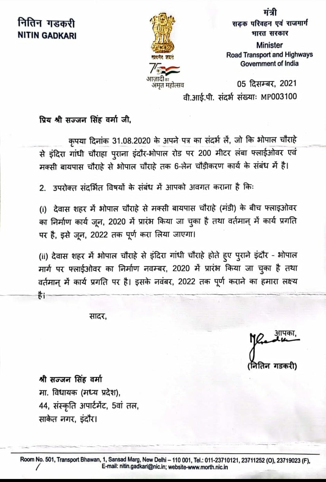 । श्री वर्मा को लिखे पत्र में श्री गड़करी ने किया खुलासा देवास = भोपाल चौराहा से इंदिरा गांधी चौराहा भोपाल इंदौर रोड पर 200 मीटर लंबा फ्लाईओवर एवं बायपास चौराहा से भोपाल चौराहा तक छह लेन चौड़ीकरण कार्य को लेकर पूर्व लोक निर्माण मंत्री विधायक श्री सज्जन सिंह वर्मा ने केंद्रीय सड़क परिवहन एवं राजमार्ग मंत्री श्री नितिन गडकरी को 31 अगस्त को एक पत्र लिखा था । शहर जिला कांग्रेस अध्यक्ष मनोज राजानी व कांग्रेस प्रवक्ता सुधीर शर्मा ने बताया कि श्री वर्मा के पत्र के प्रत्युत्तर में 5 दिसंबर को श्री गडकरी ने पत्र लिख कर अवगत कराया कि देवास शहर में भोपाल चौराहा से मक्सी बायपास रोड मंडी के बीच फ्लाईओवर का निर्माण कार्य जून 2020 में प्रारंभ किया जा चुका है तथा वर्तमान में कार्य प्रगति पर है इसे जून 22 तक पूरा कर लिया जाएगा । वही देवास शहर में भोपाल चौराहा से इंदिरा गांधी चौराहा होते हुए पुराने इंदौर भोपाल मार्ग पर फ्लाईओवर का निर्माण नवंबर 20 से प्रारंभ किया जा चुका है तथा वर्तमान में कार्य प्रगति पर है इसके नवंबर 22 तक पूर्ण करने का हमारा लक्ष्य है। पत्र मिलने के बाद कांग्रेस नेताओं ने कहा है कि वर्तमान में बन रहे फ्लाईओवर की डिजाइन क्षेत्रीय विधायक सांसद ने बिना सड़क परिवहन एवं राजमार्ग मंत्रालय की बिना अनुमति के बदल दी है जिसकी जानकारी उनके मंत्रालय तक को भी नहीं है जिसका खुलासा लिखे पत्र से होता है। डिज़ाइन बदलने से सीधे-सीधे योजना को प्रभावित किया गया है। कांग्रेस ने मांग की है कि केंद्र सरकार की योजना को बिना सड़क परिवहन एवं राजमार्ग मंत्रालय की अनुमति के बदल देना कानूनन अपराध हे तो इसकी जांच की जाना चाहिए एवं दोषियों पर कार्रवाई होना चाहिए वही योजना पर पूर्व निर्णय अनुसार कार्य होना चाहिए यह देवास शहर के नागरिक भी चाहते हैं । योजना बदलने से शहर के लोगों में भी रोष है ।