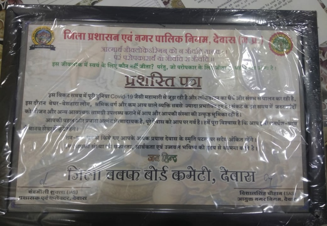 कोविड काल के वक्त,लॉकडाउन के दौरान जरूरतमंदों की मदद करने में उत्कृष्ट भूमिका के निर्वहन के लिए जिला प्रशासन एवं नगर पालिक निगम द्वारा, नगर निगम में जिला वक्फ कमेटी और ईदगाह जामा मस्जिद कमेटी ,नायता नौजवान कमेटी,को प्रशस्ति पत्र देकर सम्मानित किया गया। इस मौके पर शहर काजी जनाब अबुल कलाम सा. विशेष तौर पर उपस्थित थे।