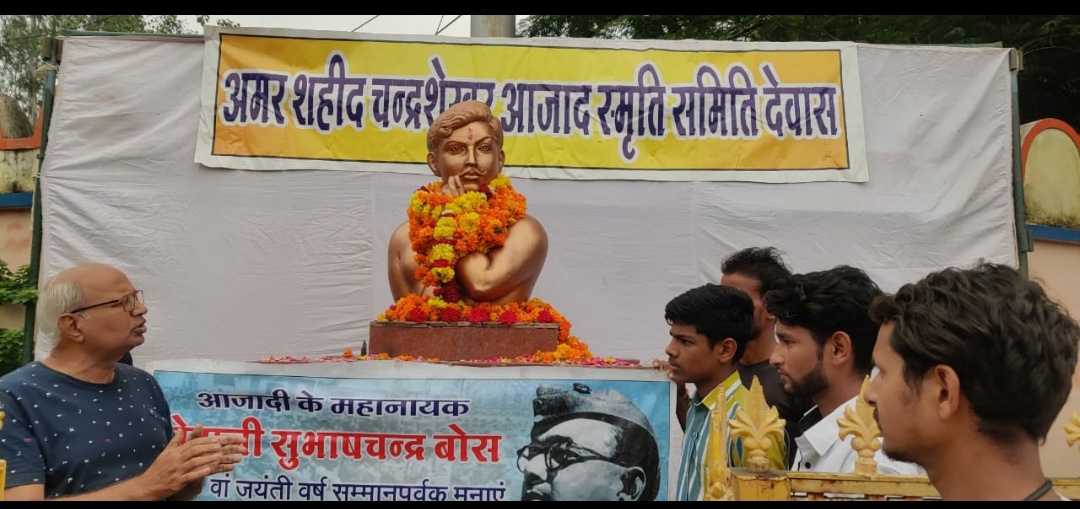 नेताजी सुभाष चंद्र बोस कमेटी देवास के द्वारा चंद्रशेखर आजाद के 116 वी जयंती के अवसर पर एमजी अस्पताल पर स्थित चंद्रशेखर आजाद की मूर्ति पर पुष्प अर्पण कार्यक्रम लिया गया। कार्यक्रम में कमेटी के अध्यक्ष श्री मोहन जोशी जी ने अपनी बात रखते हुए कहा कि आज के समय में चंद्रशेखर आजाद व अन्य क्रांतिकारियों को याद करना व उनके विचारों को जन-जन तक फैलाने की आवश्यकता है। आज जहां सांप्रदायिकता अपने पैर पसार रही है तब क्रांति