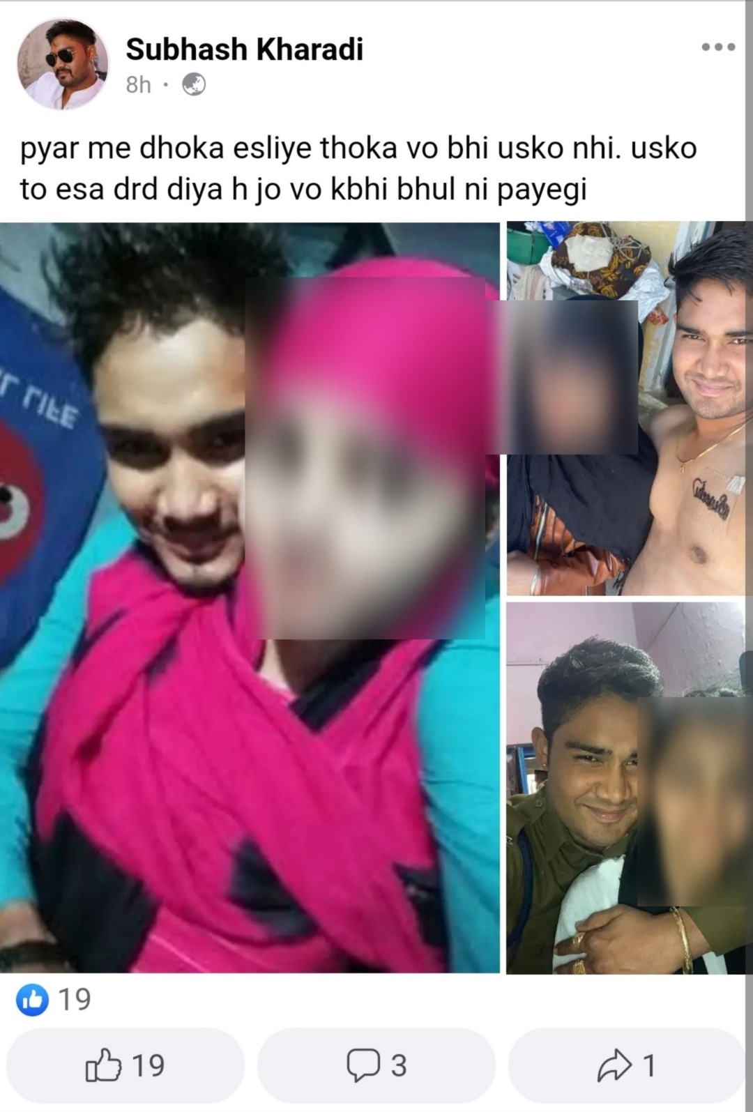 वही लड़का सुभाष कराडी मध्यप्रदेश पुलिस में हे ओर उसने अपनी फेस बुक आईडी पर पोस्ट करते हुए लिखा है की “प्यार में धोखा इस लिए ठोका और उस को तो ऐसा दर्द दिया हे जो जिंदगी भर याद रखेगी”