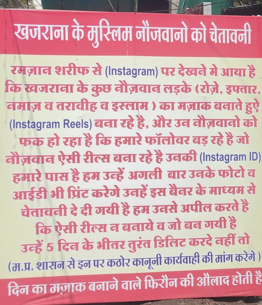 रमज़ान को लेकर रील बनाने वाले रीलबाज़ छपरियों को सख़्त क़ानूनी कार्यवाही की चेतावनी देने वाला बैनर इंदौर के खजराना में बना चर्चा का विषय